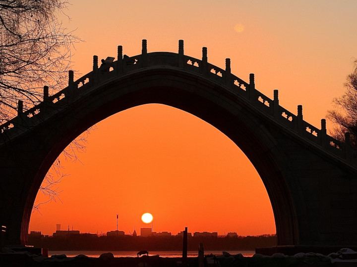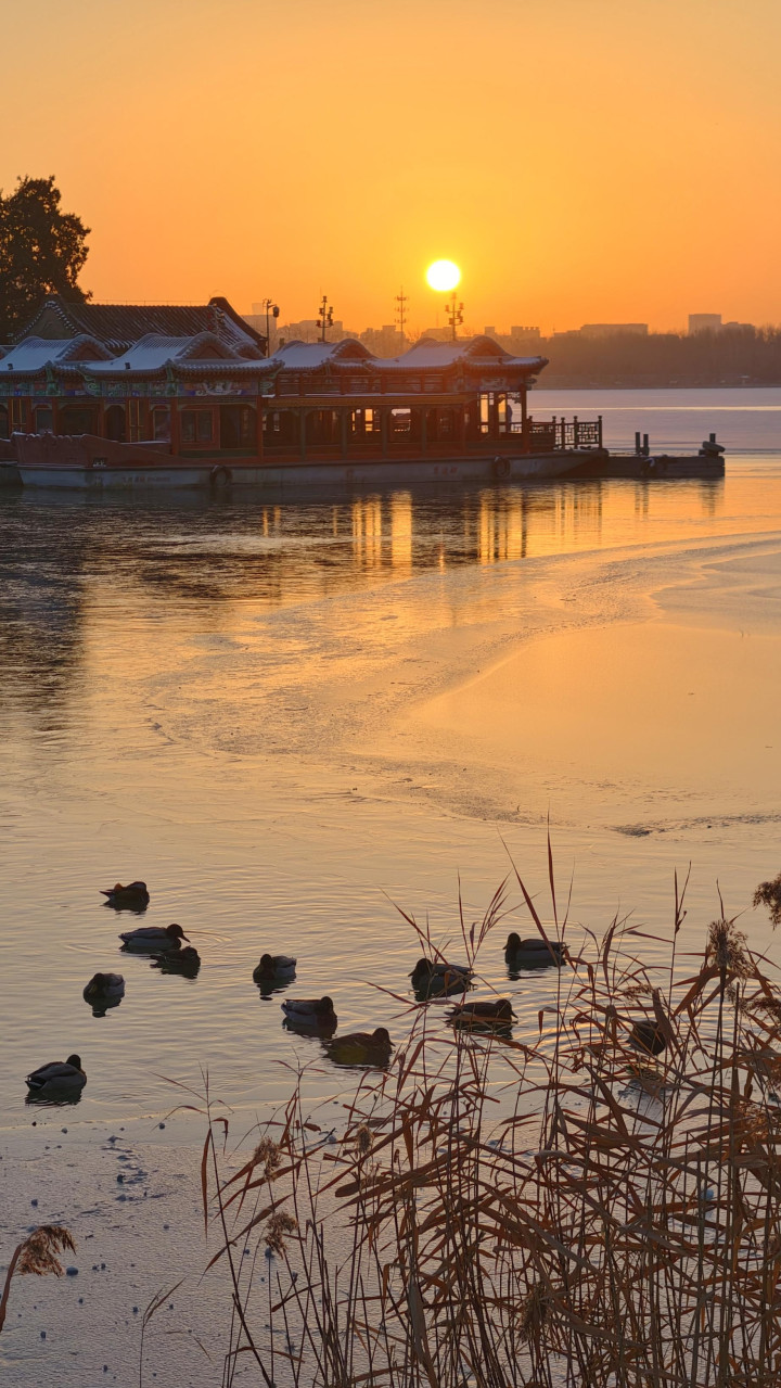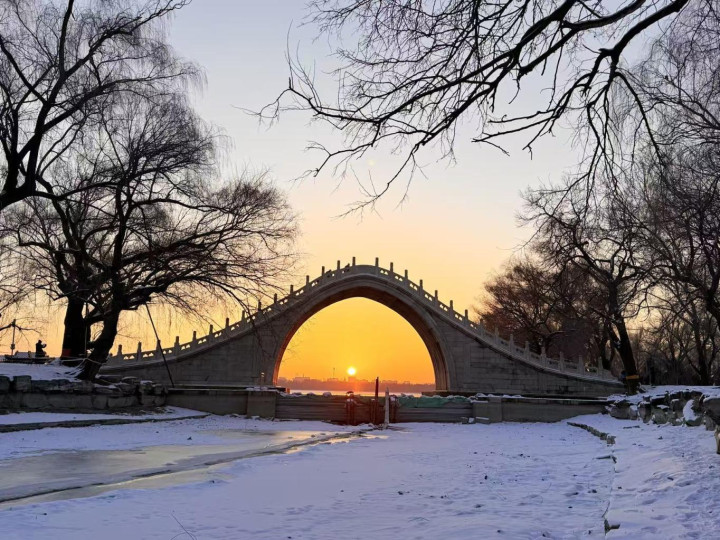 初雪未消, 美景犹在! 日出朝霞, 如诗如画